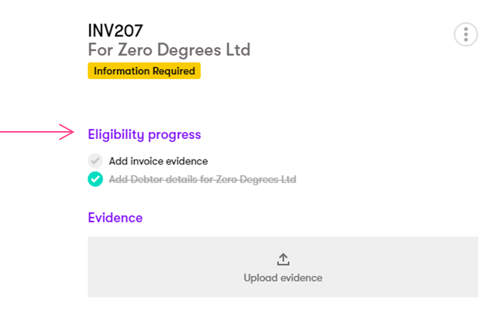 In this example, 'debtor details' for Zero Degrees Ltd have been received and verified, all you need to do is 'add invoice evidence'.