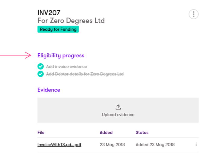 Refresh your screen and the invoice is now eligible and shows as 'Ready for Funding'.