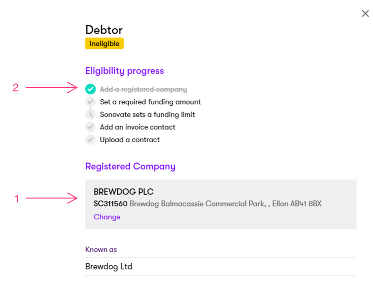 Step 2: Search for the debtor by name and review its 'eligibility progress'. 'Brewdog Ltd' currently has no evidence verified by Sonovate - .e.g. 'add a registered company' hasn't been submitted.