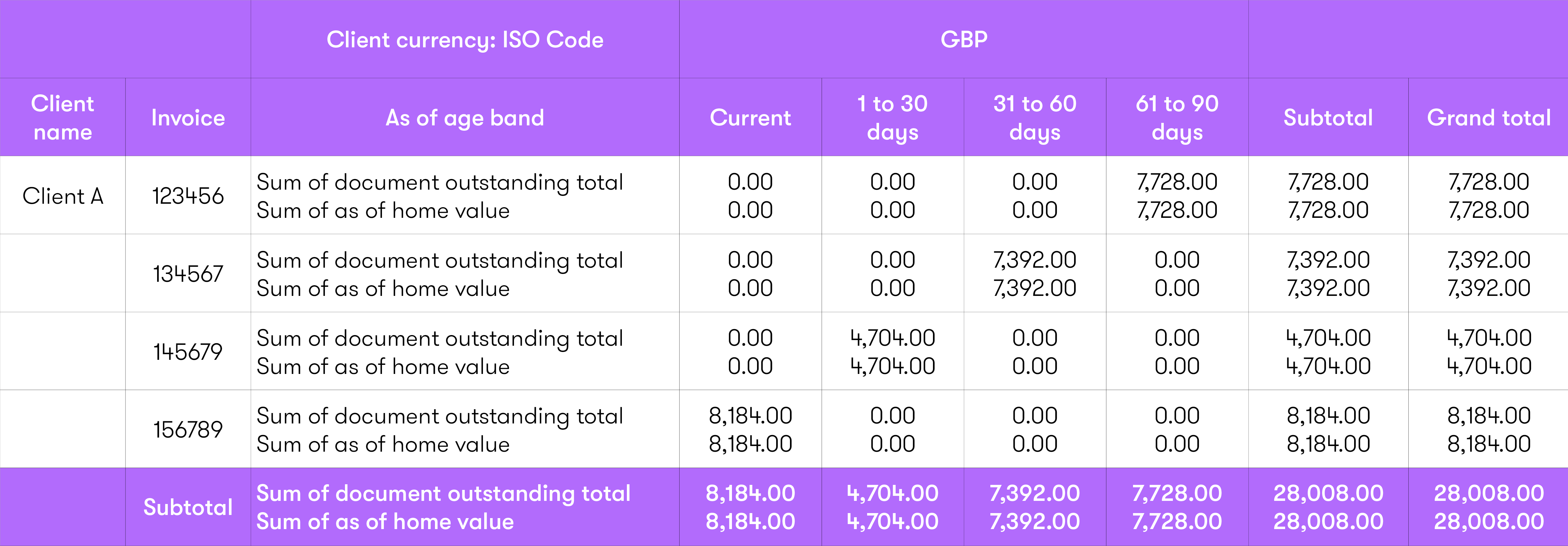 - Client A has four outstanding invoices totalling 28,008.00 GBP.