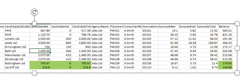 In the example below, in the highlighted cells, two candidates, Nottingham Ltd and Cardiff Ltd have not supplied VAT numbers (this could of course be correct) but the effect is that the balance paid in margin includes the VAT amount.